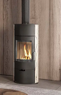 La estufa de leña Elba combina un cuerpo redondo con laterales decorados en piedra. La combinación de piedra y acero aportará textura a cualquier estancia. Con 6kw de potencia, esta estufa es capaz de generar calor y confort para su hogar.