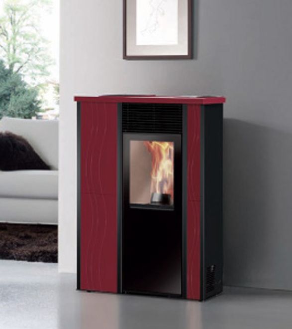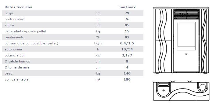 Disponible en 3 versiones: top y frontal de cerámica blanco crema, laterales de acero negro top y frontal de cerámica burdeos, laterales de acero negro top cerámica gris, frontal acero gris y laterales de acero negro. Potencia: 7 kW Rendimiento: 91% Tolva: 15 kg Consumo: 500-1600 gr/h Peso: 140 kg Medidas: 831x450x476 mm Autonomia: 24h-7,5h