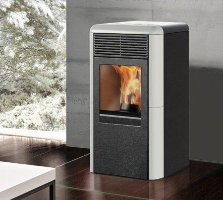 Estufa de pellet con hogar de Scamolex. Display digital para la gestión y la visualización de todas las fases de funcionamiento. Salida humos posterior, lateral derecha e izquierda, superior Ø 8 cm. Laterales de acero gris. Point Plus está dotada de ventilador para la producción de aire caliente canalizable mediante kits específicos opcionales.